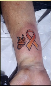 The design had to signify what brought us together, namely FSHD. I chose the orange ribbon for FSHD awareness combined with the monarch butterfly. According to an article by Crystal (2023) on the A-Z Animals website, “Orange butterflies are often associated with the sacral chakra, which represents creativity. The sight of an orange butterfly is often seen as a reminder to embrace change. Their transformative journey from a crawling caterpillar to a graceful butterfly serves as a powerful metaphor